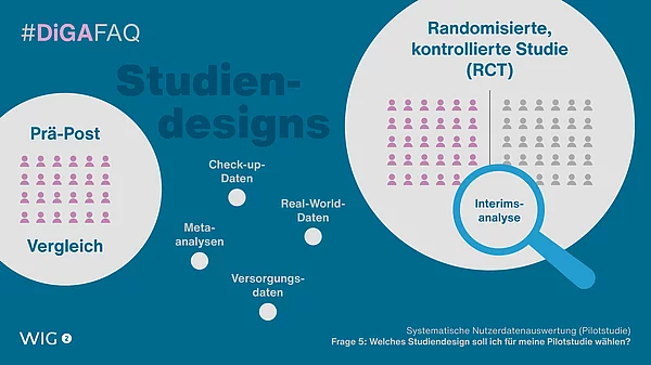 Die Wahl des Studiendesigns für die Pilotstudie hängt stark von der definierten Standardversorgung ab. Gehört es beispielsweise zur Standardversorgung, dass die Patient:innen eine Physiotherapie erhalten, so ist ein Prä-Post-Design nicht empfehlenswert, denn die erzielten Effekte könnten dann auf ebendiese Physiotherapie zurückzuführen sein. In diesem Falle wäre eine randomisierte, kontrollierte Studie mit einer Interventions- und einer Kontrollgruppe die bessere Wahl – denn mit Hilfe der stattfindenden Randomisierung wird eine mögliche Beeinflussung des Versorgungseffekts durch die Therapie gleichmäßig auf beide Studiengruppen verteilt. Dies gilt auch für primäre Endpunkte, die stark abhängig von der subjektiven Einschätzung der Patient:innen sind (z. B. Lebensqualität). Eine mögliche Vorgehensweise ist die ergänzende Durchführung einer sog. Interimsanalyse, also eine zusätzliche, zwischenzeitliche Auswertung von Daten. Diese Variante ist mit deutlich weniger Aufwand (es muss z. B. nur ein Studienprotokoll erstellt werden) und damit einer höheren Zeitersparnis verbunden.